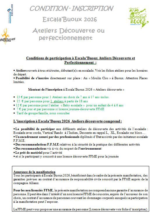 Tous les participants à ESCALA'BUOUX bénéficient dans le cadre de la présente manifestation des garanties prévues au contrat d'assurance de résponsabilité civile soucrrit par le F.F.M.E auprès de la compagnie d'assurance Allianz.